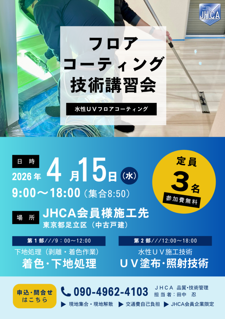 このたび、今期最後の現場研修として、「フロアコーティング技術講習会(水性UVフロアコーティング)」を開催する運びとなりましたので、ご案内申し上げます。